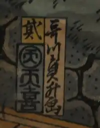 Both panels bear publisher's marks associated with Tenki. The seal is a stylized version of the character 天 (ten) contained within a circle. This appears directly above the full characters for Tenki (天喜).[4] Operating under the firm name Kinkadō (金華堂), Tenki, or Tenmaya Kihei (天満屋喜兵衛) as it was also known, was an active publishing house from 1816 into the 1850s.[5] Ukiyo-e scholar Andreas Marks notes that the seal version appearing in View of Tempōzan Park in Naniwa was used by Tenki on prints from 1826 to 1838.[6]