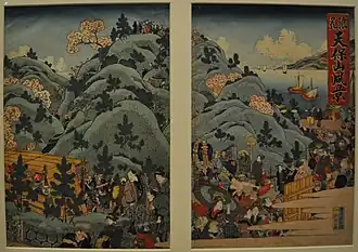 After pine and cherry trees were planted on its slopes, Tempōzan drew increasing numbers of visitors, particularly in spring when it was customary to participate in o-hanami (お花見) cherry blossom viewing.[22] As it developed into a popular leisure spot, kakechaya (掛茶屋) tea houses and cafes sprang up to service the crowds.[23] Sadamasu's print offers a panoramic view of Tempōzan crowded with visitors partaking in o-hanami. The mountain is encircled by a stone wall and bounded on the other side by the bay and port. The scene is lively, packed with figures whom Sadamasu depicts in considerable detail. Those depicted fall into various social ranks and classes including courtesans and geisha, samurai, servants, hawkers and chōnin townspeople. It provides a graphic example of what Calza describes as "the life and social whirl" of the Edo period.[24]