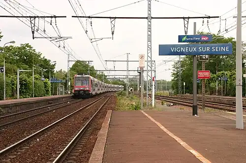 Vigneux-sur-Seine is a railway station in Vigneux-sur-Seine, Essonne, Île-de-France, France.[2] The station was opened in 1973 and is on the Villeneuve-Saint-Georges–Montargis railway. The station is served by the RER Line D, which is operated by SNCF. The station serves the commune of Vigneux-sur-Seine.