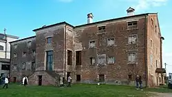 The villa was designed and built in the 1540s for the Venetian Taddeo Gazzotti and, like a number of Palladio's buildings, it incorporates a pre-existing structure. In 1550, before the building was completed, Gazzotti was facing financial problems and sold the villa to Girolamo Grimani.[1] The external form of the villa shows the person who commissioned it to have been a man who wanted to make his influence clearly visible. For the first time Palladio presents the body of the building as a clearly defined cube. The three-fold arcade in the central section, which is reminiscent of Villa Godi, is crowned by a pediment and is the dominant shape of the facade. It is less the embodiment of an original body of thought of Palladio's – comparable examples can be found both in Villa Agostini in Cusignana and in the architecture of Giovanni Maria Falconetto – than of his endeavour to give existing forms of new expression. What is new is that the three-fold arcade takes up the entire height of the one-story building. Equally, the use of a pediment as a symbol of dignity has no counterpart in Venetian secular architecture of that time. A wide flight of steps was originally meant to lead up to the loggia; the narrow flight of steps which now leads up to the center arcade in the loggia is a latter addition.[3]: 32