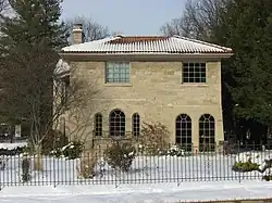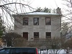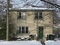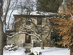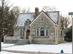 As limestone workers and owners, the residents of Vinegar Hill naturally looked to limestone as the material for their own houses.[2]: 89  They used these materials to construct residences in a wide range of architectural styles, including American Craftsman, Neoclassical, and Art Deco. Inside, the houses were also ornate: many feature mantels and balusters of carven stone,[3] and the four houses built by Christopher Donato also include elaborate transoms and lintels. The most prominent houses in the neighborhood are the hilltop homes of the wealthy near the eastern end of the district; here may be found styles such as Tudor Revival and Georgian-influenced Colonial Revival.[2]: 90  Throughout the district, many houses are found in various forms of Colonial and English Revivals,[4] and multiple Spanish Colonial Revivals are among the most significant residences of the lower part of the hill. Among the books that have concentrated on the architecture of Vinegar Hill is Carol Shields' novel The Stone Diaries, in which the neighborhood is part of the setting for much of the novel.[2]: 91
