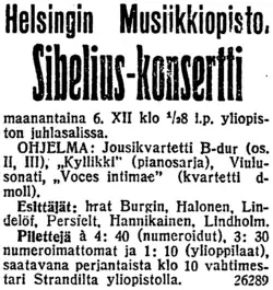 A 6 December 1915 advertisement promoting the premiere of Sibelius's Violin Sonatina
