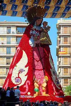 The highlight of the festival takes place on Sunday mid-morning when the image is carried from her basilica, (Basilica de la Virgen de los Desamparados) on 'Plaza de la Virgen' to St Catherine's cathedral over a distance of approximately 200 m. She is adored with rose petals being thrown down from balconies and people crying and shaking with the emotion of the spectacle.