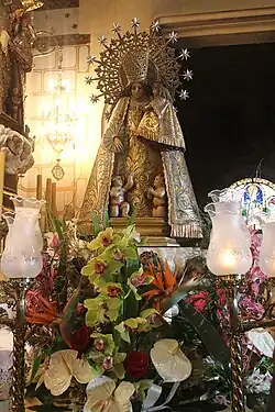 Our Lady of the Forsaken (Spanish: Virgen de los Desamparados or Nuestra Señora de los Desamparados; Catalan: Mare de Déu dels Desamparats, IPA: [ˈmaɾe ðe ˈðew ðelz ðezampaˈɾats]) is a Catholic invocation of the Virgin Mary.[1] She is the patroness of Valencia and one of seven patrons of the Autonomous communities of Spain. She appears with a lily in one hand and in the other, she carries the baby Jesus who bears the cross in his arms. Her posture is characterized by a slight forward tilt, and hence, she is known affectionately as the Geperudeta (hunchback) of València.[2] Her image is housed in the 'Basilica de la Mare de Déu dels Desamparats'.
