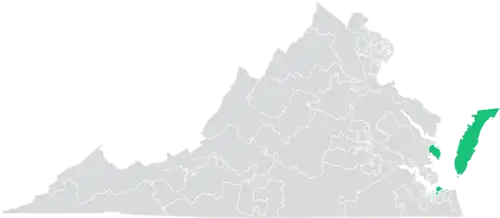 Former District 6 was a disparate district which included Accomack County and Northampton County on the Eastern Shore, Mathews County on the Middle Peninsula, and parts of the Hampton Roads cities of Norfolk and Virginia Beach.[5]