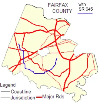 A map of Fairfax County shows that SR 645 is somewhat circuitous: Wall Road is east–west, Lees Corner Road, Stringfellow Road, and the northern part of Clifton Road are north–south, the rest of Clifton Road is mostly east–west, and Burke Lake Road is northeast–southwest.