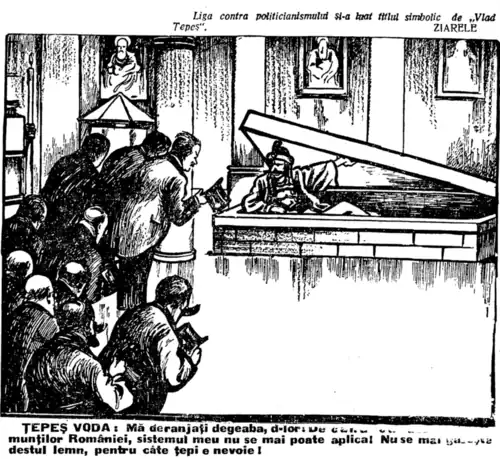 With its choice of name, the group honored the medieval prince, Vlad the Impaler, who was ruthless against corruption. Vlad was notably the protagonist in a 1930 play by Ludovic Dauș, which documented his many violent repressions and hinted at his necessary return.[23] This cultural nod was reviewed by the humorist Nae Dumitrescu Țăranu, who doubted that Filipescu cold ever fulfill the promise: even in the event that all "scoundrels" and "exploiters of the country" would find themselves impaled on Filipescu's orders, some would bribe the executioner and have their stakes fitted with "comfy stools".[24] In a June 1931 debate, George Grigorovici of the Social Democratic Party (PSDR) argued that impalement was an Ottoman practice, and hence that it reminded one of an uncomfortable time in Romanian history.[25] As noted in 1932 by the review Le Monde Slave, the Vlad reference condensed the League's own "political romanticism": "it wants to purify public life using strong measures, if need be through blood and iron, that is to say by dictatorial means." Its violence was "a verbal violence, within the limits of legality."[26] As early as August 1929, journalist I. Hașegan noted that Filipescu's group had opportunities created for it by the other political players, capitalizing on their mistakes. Between the other parties' internecine "fight for extermination" and "infamies", the "reactionaries" could "garner sympathy and adhesion from all around."[27]