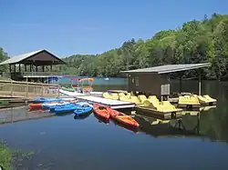 The centerpiece of the park is Lake Trahlyta. The lake has a swimming beach and boat launch for non-motorized watercraft, and offers seasonal rentals for pedal boats, kayaks, and paddle boards. It contains bass and bream and is stocked periodically during each trout season with about 5,000 trout.[11] Also at the park are a general store, miniature golf course and a Civilian Conservation Corps museum.