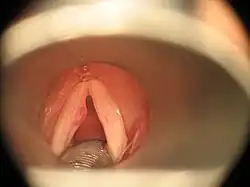 A voice prosthesis is an artificial device, usually made of silicone, that is used to help laryngectomized patients speak. A tube is inserted into the neck, below the vocal folds, allowing air to go through the tube instead of through the mouth and nose.[18] Following a total laryngectomy, air will no longer pass through the vocal folds, significantly altering the person's ability to communicate orally.[18] In some instances, the person may be able to block the tube with their fingers and breathe as they did before the surgery or attach a valve to their tube, which serves to allow air to enter while preventing food from passing into the windpipe. In others, this is not a viable option due to resistance, infection, and insufficient air.[18] Voice therapy may then be turned to as a means for a person to regain the ability to communicate orally. Voice prostheses and ventilators may affect the volume of the speaker and the overall quality of the speaker's voice.[18] With the help of voice therapy as well as possible adjustments to ventilator settings, the goal is to become accustomed to using the device functionally and to learn the techniques and skills needed to participate in daily communication.[3]