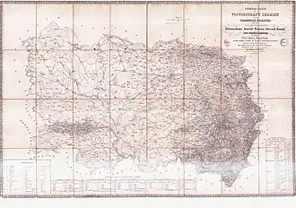 Later, it was divided into five districts[13][14] (contemporary German: Districte, modern spelling Distrikte), which were largely based on the pre-1849 Hungarian counties which made the majority of the crown land.[14] From 1851 they were subdivided into political districts ((politische) Bezirke).[14] In the reforms of 1853, implemented in the crown land in 1854, the Districte became Kreise, which were subdivided into Amtsbezirke (formally Bezirke but of a different type than in 1851).[4] These reforms also separated the capital, the city of Temesvár, from district-administration, placing it under the direct authority of the Statthalterei.[4]