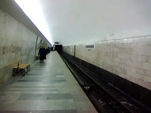 The station is lain deeply underground and is a pylon trivault, which is separated by arcades of tracks. The station itself was designed by V.A. Spivachuk, and engineered by Y.E. Kruk and Y.A. Korovkin. The floor has been finished off with grey and black flags of polished granite. The lighting comes from hidden niches under the curved ceilings.