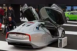 The Volkswagen XL1 (VW 1-litre) is a two-person limited production diesel-powered plug-in hybrid produced by Volkswagen. The XL1 car was designed to be able to travel 100 km on 1 litre of diesel (280 mpg‑imp; 240 mpg‑US), with a fully charged battery, while being both roadworthy and practical.[4] Without using electric, the XL can travel 100 km on 2 litres of diesel.[5] To achieve such economy, it was produced with lightweight materials, a streamlined body and an engine and transmission designed and tuned for economy. The concept car was modified first in 2009 as the L1[6] and again in 2011 as the XL1.[7]