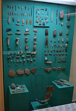 Excavated remains show that the morphological characteristics of the people of the Volosovo culture are craniologically related to the Lapponoid group.[10] The stone and ceramic artifacts that are used to describe the Volosovo culture were from the semi subterranean dwellings, which are often situated in river floors and within the area of lakes.[3] These dwellings have lower and upper cultural layers. The artifacts found in the lower layer indicates a cultural affinity with the Russian Pit-marked Pottery culture called Balakhna.[9] The upper level, which is considered the actual Volosovo phase, included ceramics that were distinct from the pit-marked pottery as well as those attributed to the Fatyanovo culture.[3]