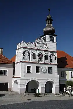 The historic town centre is formed by Svobody Square and adjacent streets. The main landmark of the square is the Renaissance town hall, built between 1521 and 1529. Other historical buildings include Gothic fortress from the 14th century, Church of All Saints from same period, Church of the Transfiguration, which was built between 1580 and 1618, and Jewish synagogue that dates from 1939. A Marian column located in the middle of the town square dates from 1760.[3][7]