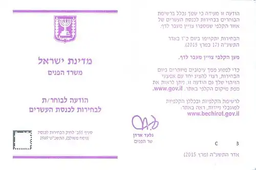 Voter invitation card for the 2015 Israeli legislative election
