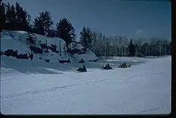 The park is snow-covered from late November until early April. An ice road on Rainy Lake is plowed and marked from the visitor center's boat ramp, heading toward Cranberry Bay or around Dryweed Island, depending on ice conditions. Available activities include lake driving, snowmobiling, cross-country skiing, winter camping, ice fishing and snowshoe hiking. Snowmobiling is limited to the frozen lake surfaces and the Chain of Lakes Scenic Trail through the center of the Kabetogama Peninsula. Trail maps can be obtained from the visitor centers.[9]