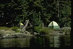 Surveyor's Island is on the east end of Rainy Lake marking the entry to the American Channel to Kettle Falls. Here the boundary surveyors had a campsite during the early 1900s. Voyageurs would use this island as a stop before they entered the open waters of Rainy Lake.[29]