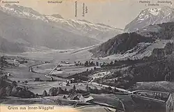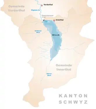 The old village of Innerthal was flooded in 1924 when the dam Schräh was constructed. A new village was built on the current lake.