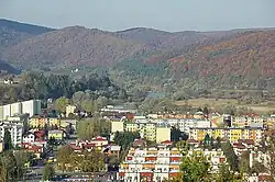 ![]() View of the district from the hill in Trepcza in 2024, with Downtown in the background | |