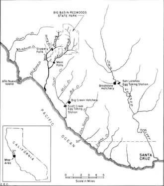 Historically, Waddell Creek was home to spawning runs by both steelhead trout (Oncorhynchus mykiss) and coho salmon (Oncorhynchus kisutch).[8] In 1995, a review of coho south of San Francisco Bay found coho restricted to only one remnant population in Waddell Creek, one small naturalized (hatchery-influenced) population in Scott Creek and a small hatchery-maintained, non-native run in the San Lorenzo River, all in Santa Cruz County. Historically, coho were found in approximately 50 coastal drainages in San Mateo and Santa Cruz counties, but by the 1960s, spawning runs were limited to 11 stream systems. The 1995 combined average annual spawning population of native and naturalized coho salmon in Waddell and Scott Creeks was estimated at only 50–60 adults, comprising only 1.5% of the estimated abundance of coho salmon south of San Francisco Bay in the early 1960s.[11] Coho vanished from Waddell Creek, but there is hope of returns from the Kingfisher Flat Hatchery on the Big Creek tributary to nearby Scott Creek where the salmon returned in 2015 due to stocking efforts.[12]