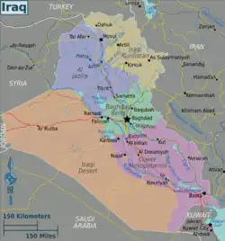 Wadi Hauran (also Wadi Houran, Wādī Ḩawrān Arabic: وادي حوران) is the longest wadi in Iraq. Located in Al Anbar Governorate west of Iraq, at Latitude 33.0333°, Longitude 40.2500°[1] it's roughly midway between Damascus and Baghdad near the town of Rutba, it stretches for 350 kilometres (220 mi) from the Iraq–Saudi border to the Euphrates river near Haditha.[2][3]