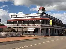 The Palace Hotel was built in 1905. The two-storey Federation Filigree style building with large verandahs in located on Trudhoe Street. The original owner was Paddy. B. Durack, who also owned a sizeable property east of Wagin known as Behn Ord. Significant extensions were added to the building in 1911.[12]