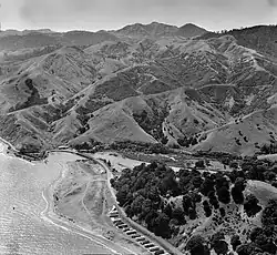 The area used by the boat ramp (since 2001)[6] and car park is part of a delta formed by the river.[7] Shingle was taken off the delta from at least 1920[8] to 1937.[9] The 219 ton[10] Devonport Steam Ferry paddle steamer Eagle[11] (1886-1924)[12] was on the beach at least from 1925[13] to 1927.[14] Former Auckland tram bodies were moved to the south end of the delta in 1953 for use as holiday baches.[15] Ngāati Tamaterā regained the delta and other areas under a Settlement dated 20 September 2017,[16] following Land Court irregularities dating back to 1878.[6]