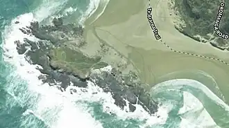 Wakatehāua Island is a very small island, beside Te-Oneroa-a-Tōhē / Ninety Mile Beach, one of only two Northland west coast islands (the other being Matapia Island, further up the beach). As the island looked like a canoe, it was given the name Te Waka e Haua.[1] The area may have been populated from the 14th century.[2] Senecio repangae grows on the island.[3] In 1935 tree stumps were exposed, which it was suggested showed evidence that the island had been part of the mainland until they were covered by sand.[4]