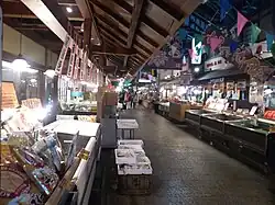 An ichiba is a market, of which there are two in Marina City. The larger is a "fisherman's wharf"-style fish market, which sells both fresh-caught fish and cooked fish dishes. There are small fire pits available both inside and outside to allow guests to cook their purchases on site. Aside from the food, the principal attraction is a whole tuna filleting show. The building itself features 6,767.08 square meters of floor space on four levels.[26] The smaller market is an outdoor farmers market, featuring fruit and vegetables from the local farmers.[27][28]