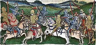 In the same year, Wallachia was invaded by Charles I of Hungary who was seeking to recapture the "marginal lands" held by Basarab.[13] The Hungarian royal army captured Severin in September, appointing Dionysius Széchy as Ban. Due to the poor supplies of Charles' army, he was compelled to sign an armistice and retreat from Wallachia.[14] His army was ambushed by Basarab in a mountain valley on 9 November. According to historian Constantin Rezachevici, in the first phase of the battle which lasted two days, the Hungarian army was stopped in the valley and attacked with ranged weapons. The last two days of battle were primarily fought in melee combat, which marked the character of the battle.[15] While portrayed only as peasants armed with bows and rocks in the Illuminated Chronicle, the Wallachian army of Basarab was just as well equipped as the King's army as noted by Stephen, the son of the Cuman Ispán Parabuh.[16]