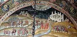 3. ^ The fresco depicts the Battle of the Milvian Bridge, but the soldiers are shown in contemporary Wallachian equipment of the 17th century.[45]