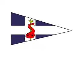 In 1921 the Magazines Sailing Club changed its name to the Wallasey Yacht Club, when Wallasey itself became a municipal borough. At the time of the name change the club burgee remained a white cross on a blue background, it wasn’t until May 1937 that a red dolphin round a gold trident, based on the Wallasey coat of arms, was added and this design has been used ever since.[1] The present club house in Hope Street, New Brighton, has been occupied by the club since 1910.