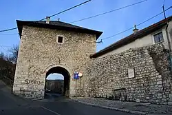 Višegradska kapija (transl. Visegrad Gate) was the main entry point to town and is one of the three city gate-towers in the Vratnik Old Town with the other two being Sirokac Tower and Ploca Tower. It was built between 1727 and 1739, in limestone and a special Bosnian stone "hreša" with roof shingles. Traffic went east via the main road towards Višegrad (thus the name) and continued further to the east towards Istanbul.[1]