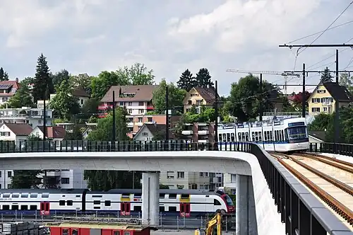 A tram descends into Wallisellen station from the Stadtbahn viaduct, whilst an S-Bahn train departs | ||||||||||||||||||||||||||