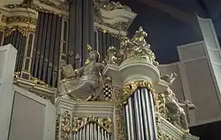 The church received its first pipe organ in 1680, built by the Ghent organ builder Nicolaas Langlez. This organ however proved unsatisfactory and was frequently altered until Christian Müller was commissioned in 1733 to build an entirely new organ, which was taken into use the next year. This organ is still in use and is considered the best-preserved of the Müller organs still in existence. In subsequent years the organ was repeatedly repaired and altered, until the church in 1960 decided to restore the organ to its original state. This restoration by organ builders Ahrend & Brunzema was completed in 1965, followed by a second restoration in 1993 and a third in the year 2000.