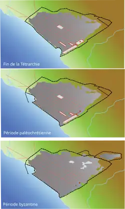 In the 3rd century, fortifications were built to protect the city from the Goths with materials from previous buildings. With these fortifications, two Gothic attacks were repelled, in 254 and 268. The Roman wall was 1.65 m wide, with square towers.[2] The main street of the city (Leoforos or Mesi) extended from the Golden Gate in the west (Vardario Square) to the Cassandreot Gate in the east. The southern wall extended somewhat further south of today's Tsimiski avenue.
