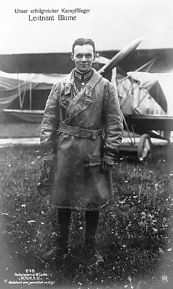 Walter Blume (10 January 1896 – 27 May 1964) was a German fighter ace of World War I. During World War I, he flew with two fighter squadrons, Jagdstaffel 26 and Jagdstaffel 9 gaining 28 aerial victories and earning the Iron Cross, Royal House Order of Hohenzollern, and the Pour le Merite.[1]