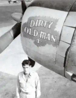 In February 1945, the 348th FG transitioned from P-47s to the North American P-51 Mustangs. In June 1945, the unit moved to airfield at Ie Shima in Okinawa, where they began flying long-range missions over the Japanese Home Islands.[1] During World War II, Benz was credited with the destruction of eight enemy aircraft, while flying 280 combat missions. While serving with the 348th FG, he flew P-47s bearing the names "The Old Man" and "The Dirty Old Man".[1][2]