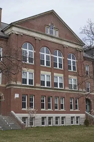 The old Waltham High School (located at 55 School Street) was constructed in 1902. Designed by Samuel Patch and Robert Glancey, it follows the local contemporary style of Romanesque and Classical Revival architecture. Expanded in the 1920s, the building eventually fell out of favor and was replaced with Waltham's second high school Waltham High School at 617 Lexington Street in 1969. It was used as the Central Junior High School in the 1970s and 1980s. The old Waltham High became defunct by the 1990s and sat empty for many years. The building was ultimately reoccupied; the additions constructed in the 1920s were removed, restoring the school to its 1902 appearance, and a modern addition was added directly behind the old building, which left the historical structure as the façade. The new construct, known now as John W. McDevitt Middle School (named for a former superintendent), entered service in 2003.[2]