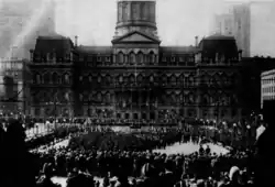 Two years after being rebuilt, the theatre was overwhelmed by the massive sized pile of marble and granite French Second Empire styled architecture with construction across the street to the west in the new domed Baltimore City Hall of 1867–1875 by George A. Frederick, (1842–1924), a municipal architect who also designed a lot of the structures in the new Druid Hill Park (established 1860) and other city structures. By the time that the theater and its surrounding block (Holliday to Fayette to North Gay to East Lexington Streets) was torn down in 1917, based on the 1910 plans of Frederick Law Olmsted, to make room for the newly laid-out War Memorial Plaza and Building, as a major rearrangement of a proposed new "civic center" of flanking municipal office buildings and structures providing additional space to be used in future decades, covering up the then unsightly canalized stream of Jones Falls to the east with its periodic flooding problems, and to open up a vista of the elaborate east front of the Baltimore City Hall, an influence of the then-nationwide "City Beautiful" movement among architects and city planners then coming to rise.[1] The War Memorial Building was designed by local famous architect Laurence Hall Fowler and originally dedicated to Marylanders who died in World War I and built in the early 1920s, dedicated 1925 and is one of many World War I Memorials for "The Great War" throughout the world built in the various participating Allied nations since the conflict of 1914–1918.