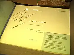 War and Peace (Russian: Война и мир, romanized: Voyna i mir) is a 1965–1967 Soviet epic war drama film co-written and directed by Sergei Bondarchuk, adapted from Leo Tolstoy's 1869 novel. Released in four installments throughout 1965 and 1967, the film starred Bondarchuk in the leading role of Pierre Bezukhov, alongside Vyacheslav Tikhonov and Ludmila Savelyeva, who depicted Prince Andrei Bolkonsky and Natasha Rostova.[2]