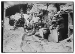 Belgian soldiers on the Yser Front read a letter from a marraine de guerre in a posed propaganda photograph, 1915.