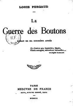 La Guerre des boutons (Fr.) or The War of the Buttons, a novel of my twelfth year (complete title) is a French novel written by Louis Pergaud, from the French region of Franche-Comté, and published in 1912. It describes the "war" between two gangs from rival villages, Longeverne and Velrans, in the countryside of Franche-Comté. The author got his inspiration from the village of Landresse, where he taught for two years. The title comes from the goal of the war, to get as many buttons as possible from the opposing side by cutting them off shirts and trousers. For the most part, the story is told from the point of view of the children from Longeverne.