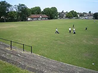 The ground is entered from the main park and is encircled by trees. The current pavilion is an extension of an existing building, which still holds the players changing rooms.[5] The buildings near the ground were used during World War II by Civil Defence personnel.[14] A raised viewing area runs along the eastern side of the ground and along the western side is a digital scoreboard. The ground could accommodate crowds of 4,000–5,000 and once accommodated a crowd of 6,000 for a benefit match for Tom Clark in 1961.[5] The cricket ground has also played host to field hockey matches, with the Bedfordshire Eagles playing there.[5] The lower cricket ground has never held county cricket matches and is the homeground of Luton Luctonian Cricket Club.