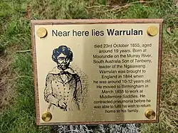 In the middle of September 1855, Warrulan fell ill. He was tended by the Birmingham surgeon Edwin Chesshire,[2] with Hodgkin visiting to confer on treatment,[2] but died at Birmingham of pneumonia on 23 October 1855.[3][4] He was buried at what is now known as Warstone Lane Cemetery in Birmingham, then reserved for members of the Church of England, in an unmarked public grave,[8][9] on 27 October.[2][4]