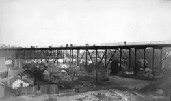 An iron truss bridge was first built here in 1884, slightly upstream from the current location (connecting Washington Avenue on both sides of the river). At the time of construction, many people lived in the river flats area below, a neighborhood known as Bohemian Flats (See photo below). The bridge was strengthened in 1890 to accommodate streetcars, and it made up part of the first interurban line between Minneapolis and neighboring Saint Paul (see Twin City Rapid Transit). Streetcar service ended in 1954. Construction of the current bridge began in 1962 and the 1884 bridge was torn down in 1965.[4]