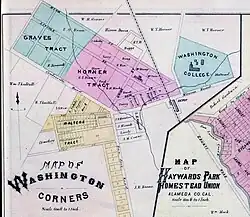 Washington College was founded in 1871 on a small hummock donated by E.L. Beard, located across from the C.P.R.R. Washington Corners depot, by the people of Washington Township as a scientific and industrial school. The founders were local landowners, educators and farmers, including W.F. Lynch, Albert Lyser, William Horner, Origin Mowry, H. Curtner, S.I. Marston, H. Crowell, and M.W. Dixon. The first building cost $30,000.[1] It opened in July 1872 with the Reverend Silas Sykes Harmon and his wife as teachers. Two of their daughters later taught there; Rev. Harmon later started a school in Berkeley.[2][3][4] It was coeducational and nonsectarian; according to its catalog, "The idea is that young women should enjoy equal intellectual advantages with young men, and that they should be educated together." Courses were given in bookkeeping, calligraphy, commercial letter writing, Latin, Greek, and advanced English. By its third year of operation, it had an enrollment of 130 students from all over the state, only some of whom lived on campus in an impressive dorm, women on the first floor and men on the second, with a gymnasium for group exercise.[1][5] The Daily Alta California on August 13, 1875, reported another year of college overflow, necessitating the procurement of entire houses from the village to house the overflow students, and called for the construction of new campus buildings for housing.[6] Washington College continued as a nonsectarian coeducational academy for eleven years until 1883.[7]