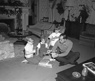 Governor Daniel J. Evans with his children in a residential room of the mansion during Christmas 1969