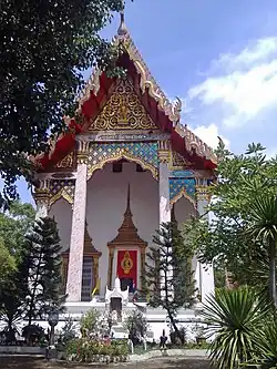 Wat Bang Nom Kho (Thai: วัดบางนมโค) is a Buddhist temple in Sena district, Ayutthaya Province, Thailand.[1] The temple was made famous by Luang Por Pan who was renowned for blowing the Diamond Armour Yant onto the foreheads of his disciples.[2] According to legend, many of these disciples, after death, were found to have an impression of the Yant mysteriously embedded into their skulls. The Yant was allegedly revealed to Luang Por Phan in a dream, which led him to its discovery on a metal template hidden within a Chedi.