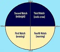 The watches of the night, or night watches, refers to the ancient practice of dividing the night into periods for the goal of keeping watch. Lasting from sunset to sunrise, guards relieved each other at each of these periods. The Hebrew and Babylonian watches of the night were divided into three military watches; the first (evening), middle (midnight) and morning watch.[2] As Christianity began, the number of watches increased to four watches due to the influence of the ancient Greeks and Roman Empire, who used four watches throughout the night.[3]